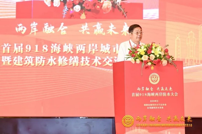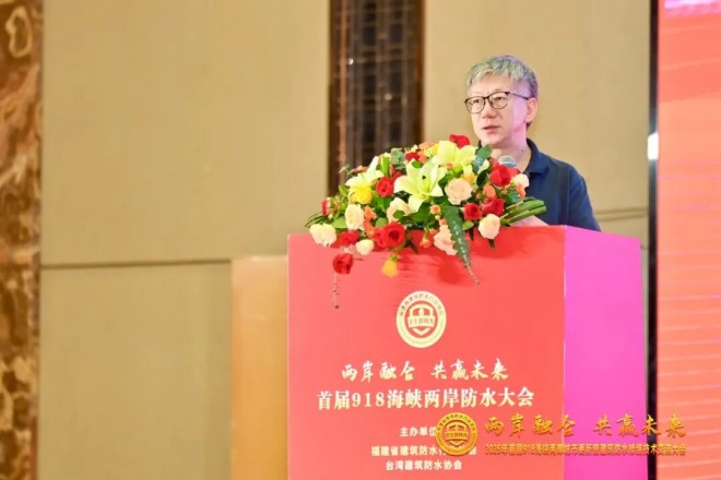 李文芳致辞,代表主办单位对到会领导、专家、嘉宾致以热烈欢迎和诚挚问候。他指出,海峡两岸一水相连,同根同源,福建作为两岸交流合作的前沿阵地,很早就与台湾防水行业开启了交流与合作,本次大会将进一步增进两岸防水同仁情谊与互信。他希望,两岸防水行业以此次大会为新的起点,秉持开放包容、互利共赢理念,深化技术交流,加强产业协作,在推动两岸防水行业融合创新、破局共赢的同时,也为推动两岸经济社会融合发展贡献防水人的智慧与力量。他坚信,通过此次大会的深入交流与思想碰撞,必将进一步推动两岸防水技术的融合创新,促进产业资源的优势互补,为两岸城市更新和建筑修缮领域的高质量发展注入新的活力。