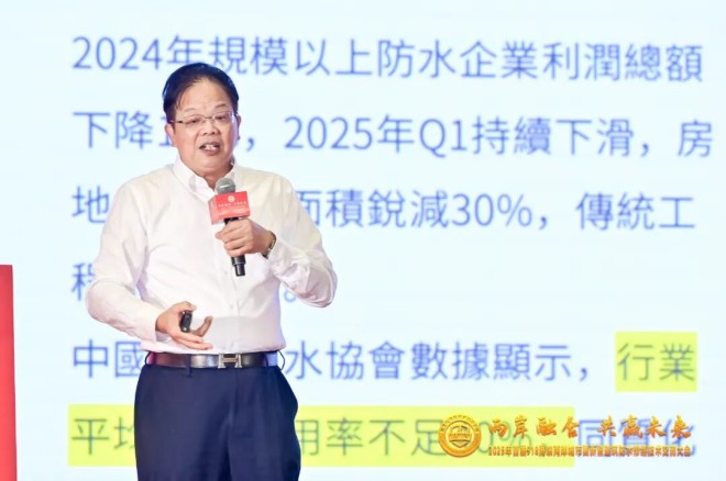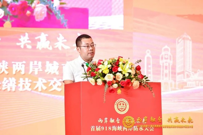 许文仁致辞指出,本次大会的成功召开,标志着两岸防水行业交流进入了聚焦城市更新、建筑修缮领域的新阶段。他简要分享了自己从十几岁开始从事防水堵漏工作的丰富经历,表示两岸防水行业当前亟需将传统防水堵漏技术与新型防水材料、技术进行深度融合。他最后希望,与会代表在本次大会上能有所收获,两岸防水行业能进一步加深交流与协作,并最终实现融合发展,共赢未来。