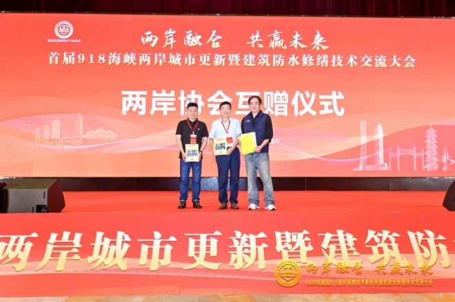 福建省建筑防水行业协会、中国硅酸盐学会防水材料专委会、台湾建筑防水协会互赠了防水标准、修缮定额、抓漏教学本等,进一步助推两岸防水技术的交流与融合。