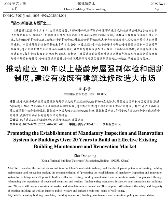 今天,“中国建筑防水杂志社丨科技号”特别推荐朱冬青秘书长刊发于《中国建筑防水》2025年第4期的专题论文《推动建立20年以上楼龄房屋强制体检和翻新制度,建设有效既有建筑维修改造大市场》。