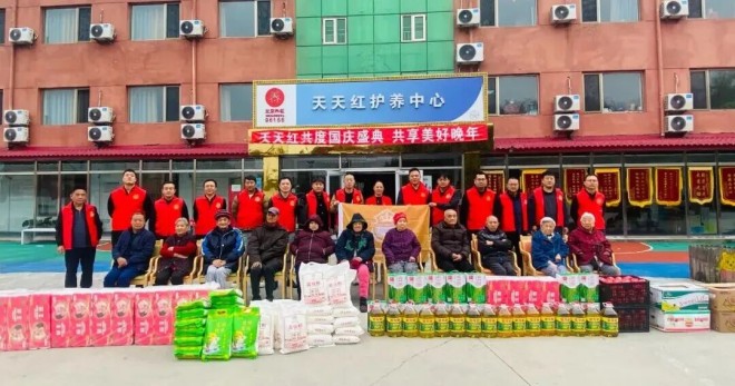 在首都北京,青年企业家分会的成员们在荣誉会长邵增峰、会长卫向阳的带领下,组成近20人的慰问小组,走进了北京天天红护养中心。他们送去了米、面、油、牛奶、纸巾等慰问物资,为老人们送上节日的祝福与温暖问候。