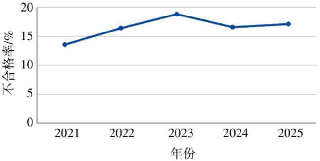 建筑防水卷材生产许可证管理制度虽然在2019年已取消,但主管部门对防水材料的生产与应用管理没有放松。国家质检总局每年开展国家监督抽查活动,各省、市质监部门也将建筑防水卷材、防水涂料、密封胶等产品作为每年的重点监督产品,开展省抽、市抽等活动。从最近5年国抽的不合格率统计(表2)及趋势(图1)来看,建筑防水卷材的不合格率趋于稳定,一直在15%~20%之间波动。