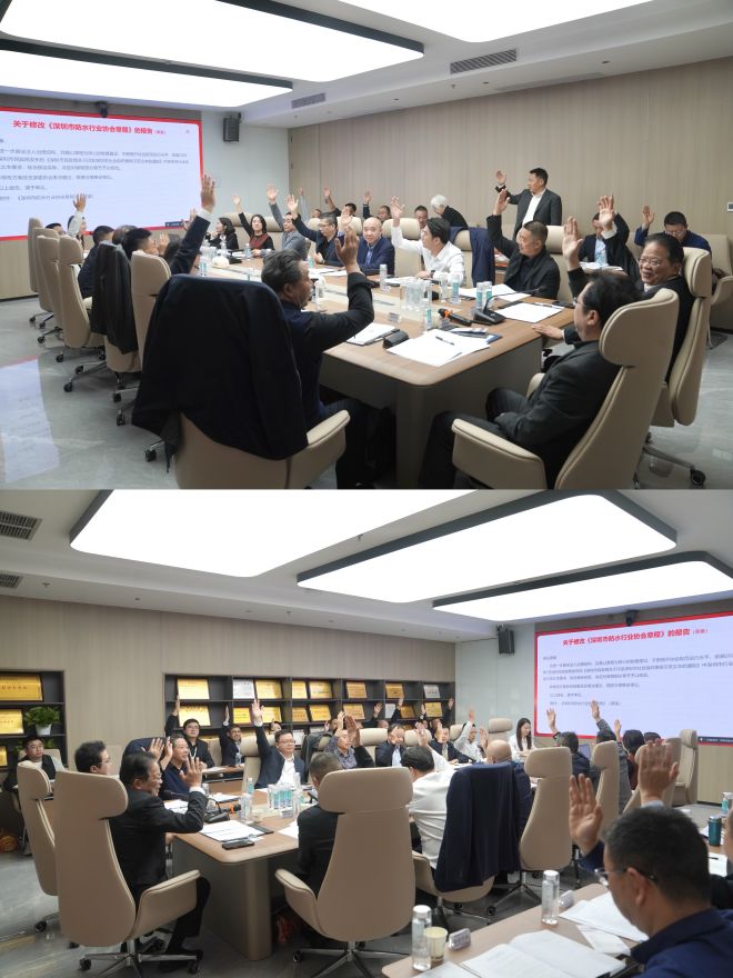理事会审议环节,由杨鸣秘书长宣读了两个议案——“关于审议确定启动换届工作并成立换届工作领导小组的议案”“关于设立深圳市防水行业协会名誉(荣誉)会长和资深副会长的议案”和一个报告“关于修改《深圳市防水行业协会章程》的报告”。