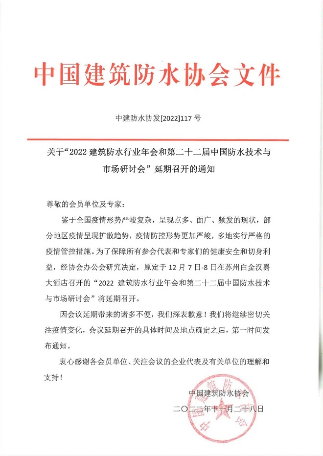 关于“2022建筑防水行业年会和第二十二届中国防水技术与市场研讨会”延期召开的通知