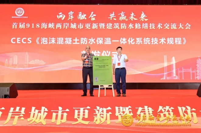 沈春林、福建省建筑防水行业协会副会长余美佑为CECS《泡沫混凝土防水保温一体化系统技术规程》首发揭幕。