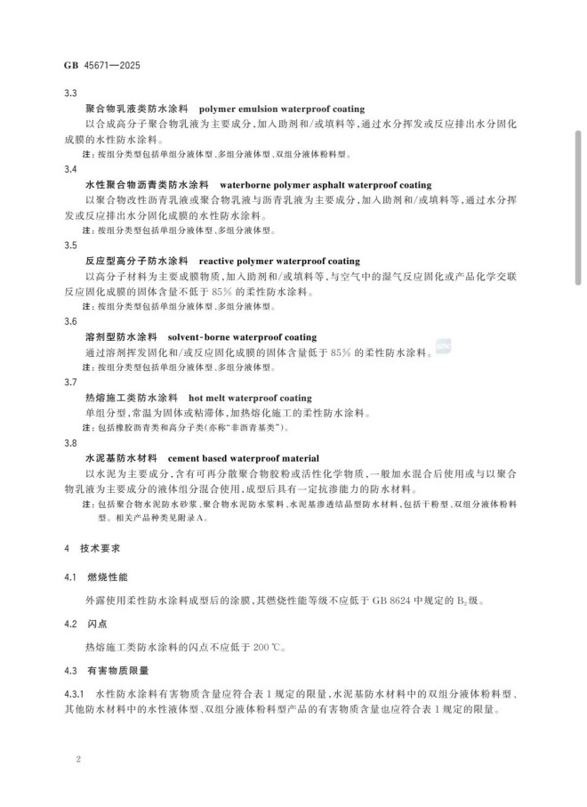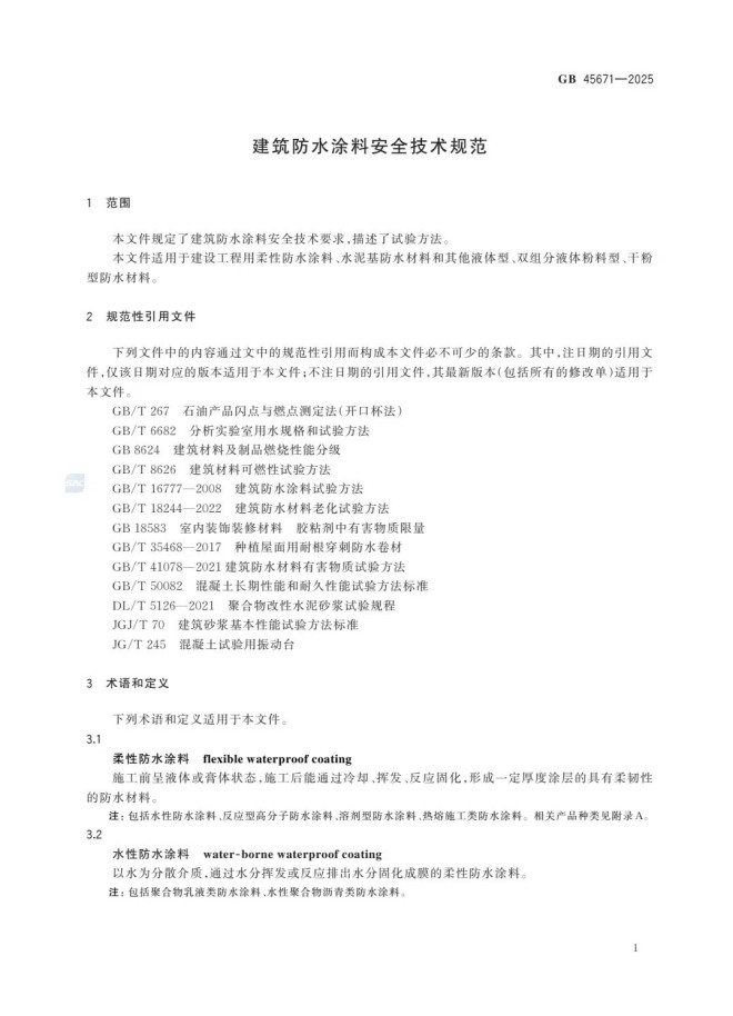 为提升人民居住环境的舒适度及保障建筑结构的安全,由国家市场监督管理总局、国家标准化管理委员会批准发布的GB 45671—2025《建筑防水涂料安全技术规范》强制性国家标准,于2025年11月1日正式实施。