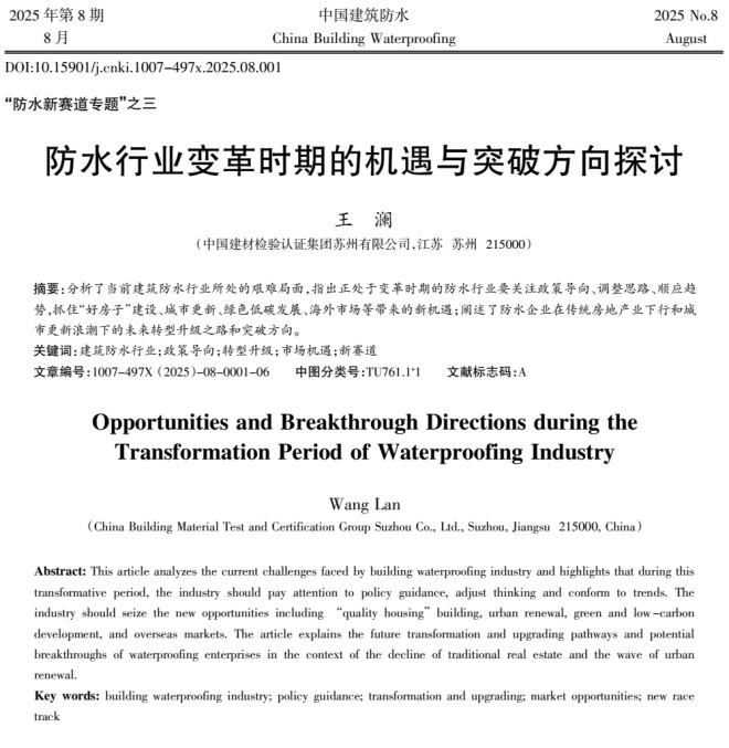 本期“中国建筑防水杂志社丨科技号”推荐国检集团苏州公司副总经理王澜刊发于《中国建筑防水》2025年第8期的专题论文《防水行业变革时期的机遇与突破方向探讨》。文章分析行业现状,提出应紧抓“好房子”建设、城市更新、绿色低碳发展和海外市场等新机遇,系统阐述防水企业在新形势下的转型升级路径与可持续发展方向,为行业破局提供思考与参考。