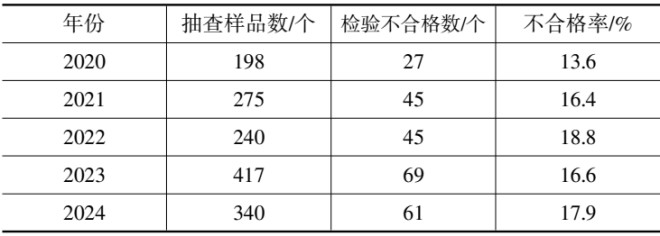表2 2020—2024年建筑防水卷材产品抽查结果