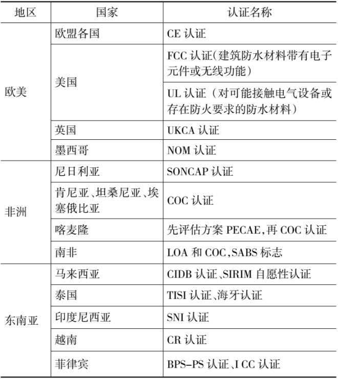 当前,有不少企业觉得国内防水市场太卷、难有突破,想尝试一下拓展海外市场,这是一种好的选择,但并非易事且不能盲目乐观。走向国外市场,一种是出口产品,一种是海外建工厂或销售公司,无论哪种,都需要做到产品质量优异,还需要符合当地的一些特殊要求、市场规则,适应当地政策、环境和金融市场变化。不同国家和地区对于防水材料的进口要求也有所不同,有些需要通过相应的产品检验和不同类别的认证。表3为部分国家和地区对防水材料进口的认证要求。