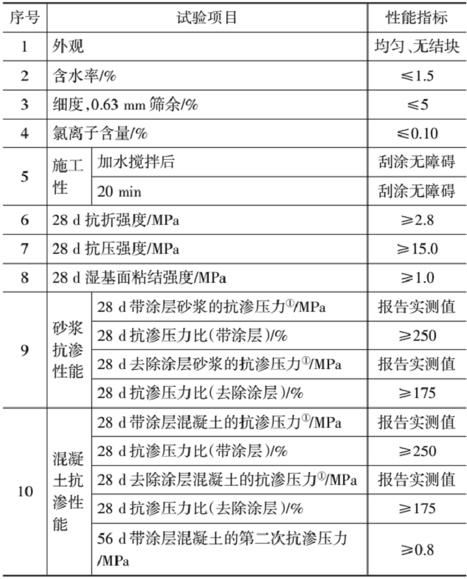 水泥基渗透结晶型防水涂料性能要求详见表1