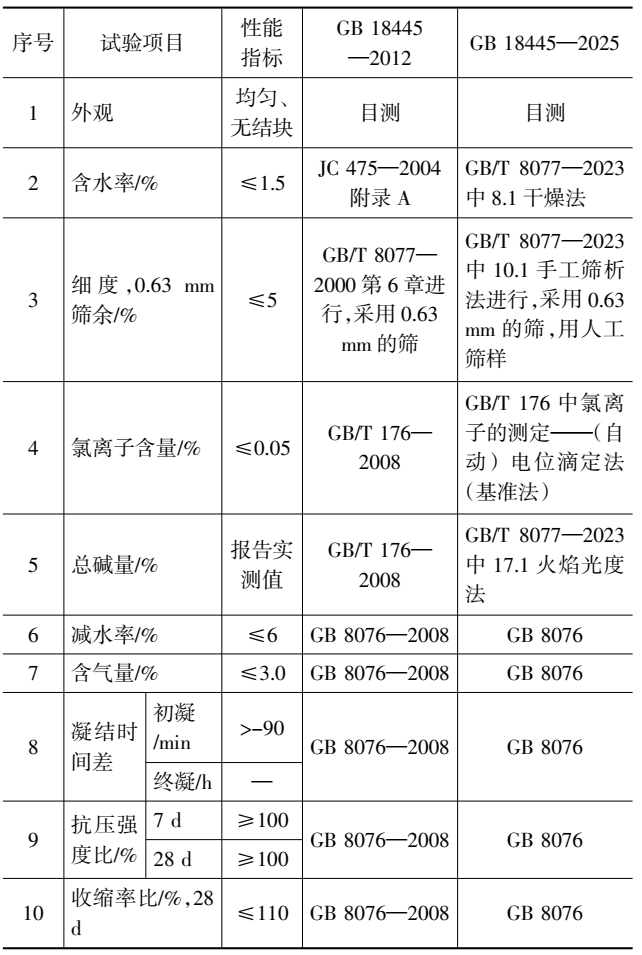 含水率测定由原引用JC 475—2004附录A改为采用GB/T 8077—2023第8.1条干燥法;细度测试统一按GB/T 8077—2023第10.1条手工筛析法进行,采用0.63 mm的筛;氯离子含量测定明确采用GB/T 176中电位滴定法(基准法)。