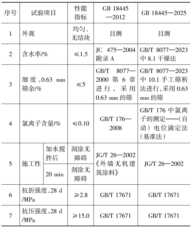 因产品发展和应用需求,2007年至2012年对GB 18445—2001进行了第1次修订,并于2013年11月1日正式实施。GB 18445—2012相较于GB 18445—2001的主要修订内容如下:修改了术语和定义;取消了Ⅰ型和Ⅱ型分类;增加了一般要求;删除了均质性指标,在技术要求中直接规定具体限值;删除了防水涂料中的“凝结时间”,改为“施工性”;删除了7 d抗折强度和抗压强度指标,并对28 d技术指标作了适当调整;增加“外观”“砂浆抗渗性能”,并在抗渗性能中新增“去除涂层的抗渗压力”;删除防水剂的泌水率比,调整减水率、含气量及抗压强度比指标,增加“外观”“第二次抗渗压力比”;增加“去除涂层砂浆与混凝土抗渗压力”的试验方法;修改粘结强度的试验方法;增加附录A(资料性附录):基准砂浆和基准混凝土的配合比。
