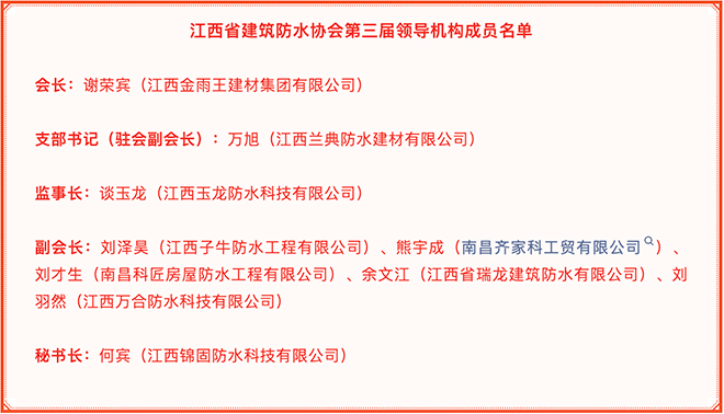 2026年3月22日,江西省建筑防水协会第三届一次会员大会于南昌圆满举行。会上,江西省建筑防水协会第三届领导机构正式诞生。谢荣宾担任会长,何宾担任秘书长,谈玉龙担任监事长。